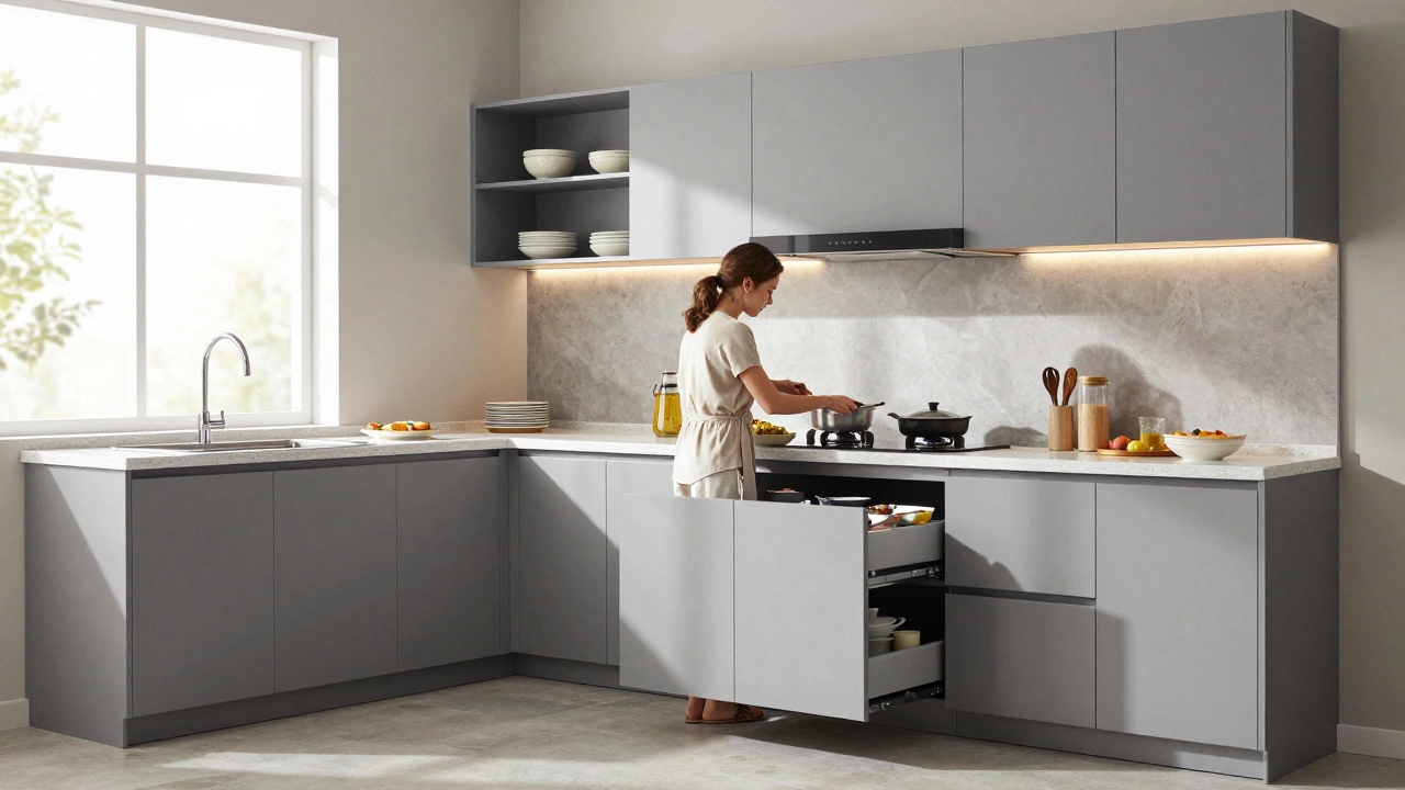 Если ваша кухня меньше 12 кв. м, угловая мебель - не вариант, а необходимость. Она позволяет использовать каждый сантиметр. Но не все угловые системы одинаковы. Есть два типа: с поворотным механизмом (вращающийся угловой шкаф) и с выдвижной телескопической полкой.